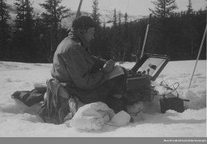 Claus Helberg sittende i snøen med radiosender/mottager utenfor Sebrekke radiostasjon mars 1945